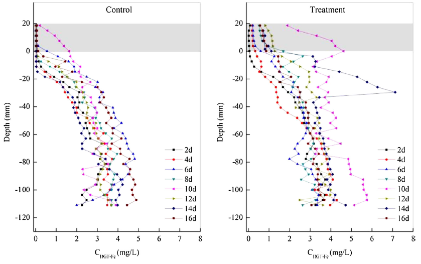 圖4、沉積物-上覆水剖面中可溶性Fe的變化。Fe的分布模式與P明顯不同,處理組和對照組均表現為隨沉積物深度增加而濃度升高的趨勢,最高值出現在培養第10天。這種一致性表明無論是否添加藻類,沉積物都是上覆水Fe的主要來源。處理組Fe濃度整體高于對照組,證實藻類分解創造的還原環境促進了沉積物中鐵氧化物的溶解釋放。