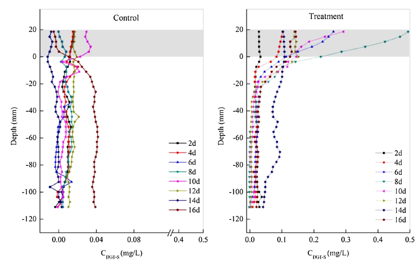 圖5、沉積物剖面中可溶性S的變化。ZrO-AgI DGT測量的硫化物分布顯示,處理組(右)S濃度在培養第8天達到峰值(比對照組高一個數量級),且高濃度區集中在SWI附近。對照組(左)S濃度整體較低且分布均勻。這種差異直接證明藻類分解是硫化物的重要來源,其釋放的硫主要分布在界面附近而非深層沉積物中。