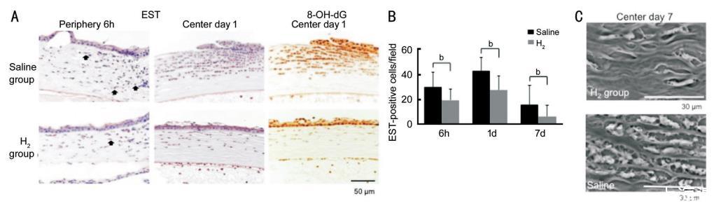 圖4 H2處理對(duì)自由基和中性粒細(xì)胞浸潤(rùn)的影響A:各時(shí)間點(diǎn)用生理鹽水或H2處理的EST染色(箭頭)損傷角膜的代表性圖像。同時(shí)還顯示了免疫染色序列切片分析中EST陽(yáng)性細(xì)胞和8-OH-dG陽(yáng)性細(xì)胞的關(guān)聯(lián)比較。B:外周角膜中EST陽(yáng)性細(xì)胞數(shù)量的柱狀圖;H2組和生理鹽水組之間存在明顯的統(tǒng)計(jì)學(xué)差異。C:使用低真空掃描電子顯微鏡和PAM染色,比較兩組的膠原纖維和浸潤(rùn)細(xì)胞。