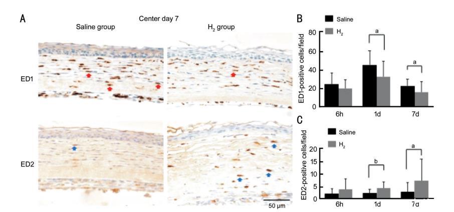 圖5H2和生理鹽水處理的角膜中巨噬細(xì)胞的表型評(píng)估A:兩組角膜中心組織ED1(紅色箭頭)和ED2(藍(lán)色箭頭)免疫染色的代表性圖像。B:外周角膜中ED1陽(yáng)性巨噬細(xì)胞數(shù)量條形圖;H2治療顯著減少了ED1陽(yáng)性巨噬細(xì)胞的數(shù)量。C:周圍角膜中ED2陽(yáng)性巨噬細(xì)胞數(shù)量條形圖。
