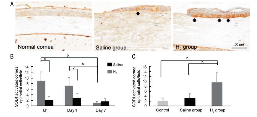 圖6 H2治療后細(xì)胞質(zhì)SOD1表達(dá)增加A:堿損傷后傷口愈合過程中SOD1(箭頭)免疫染色角膜上皮細(xì)胞的代表性圖像;B:條形圖顯示隨著時(shí)間的推移,SOD1在H2給藥過程中被激活;C:條形圖顯示在損傷后6小時(shí),H2組與生理鹽水組和正常角膜相比,中央角膜細(xì)胞質(zhì)SOD1表達(dá)顯著上調(diào)。