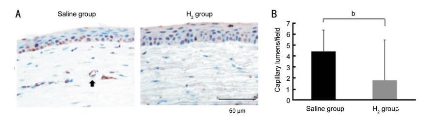圖3評(píng)估角膜新生血管對(duì)H2治療的反應(yīng)A:免疫組化評(píng)估第7天角膜中心JG12陽(yáng)性的血管內(nèi)皮細(xì)胞(箭頭);B:H2治療顯著減少了角膜中心的毛細(xì)血管管腔。