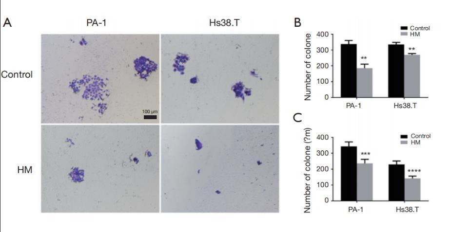 圖3、氫分子對人卵巢癌細胞克隆形成能力的抑制作用。(A)代表性圖像顯示氫分子對集落形成的抑制作用;(B)在PA-1和Hs38.T細胞中,氫氣處理顯著減少了集落數量;(C)在PA-1和Hs38.T細胞中,氫氣組的集落平均直徑均顯著小于對照組。
