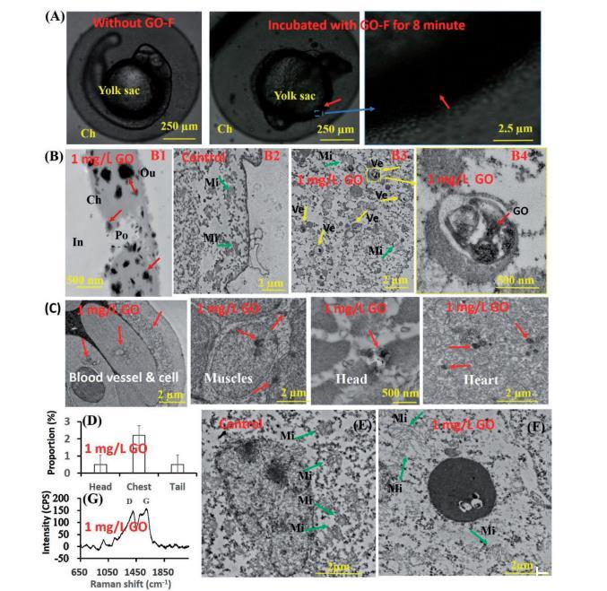 為了檢查氧化石墨烯在胚胎中的遷移情況,使用氧化石墨烯-F進行了共聚焦顯微鏡觀察。鑒于氧化石墨烯-F的熒光強度遠高于游離的FITC,而且熒光強度隨濃度的增加而線性增加,胚胎中的熒光信號應該是由于氧化石墨烯-F的摻入造成的。這一結果揭示了絨毛膜抵抗氧化石墨烯入侵的能力有限,石蠟切片、TEM和拉曼光譜的結果也證實了這一點(圖3B-G)。氧化石墨烯滲透絨毛膜的機制仍不清楚。之前有報道稱,銀納米粒子(5-46nm)可通過被動擴散穿過斑馬魚絨毛膜的孔道。TEM圖像支持上述假設,即氧化石墨烯自發地通過被動擴散穿透絨毛膜,因為絨毛膜是一個無細胞包膜。然而,與銀納米粒子(NPs)不同的是,氧化石墨烯是通過獨立的孔道穿透絨毛膜的,如圖3(B)所示。