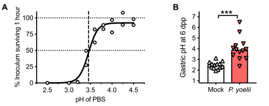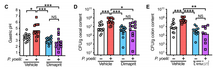 當使用pH感應微電極直接測量胃腔酸度時,與模擬感染小鼠(平均pH=2.46±0.32)相比,到6dpp時瘧原蟲感染與胃pH顯著升高(平均pH=4.02±1.07)相關(圖3B)。在感染瘧原蟲期間出現(xiàn)的低鹽血癥與定植抵抗力的喪失有關,因為在6dpp之前的小鼠中檢測不到低鹽血癥(圖S3B)。6dpp小鼠的胃普遍小于模擬感染對照組(圖S5A),部分原因可能是進食量減少(圖S5B),這與觀察到的寄生蟲感染期間體重下降模式一致(圖S2C)。由于進食可刺激胃酸分泌,我們預測觀察到的pH值差異是瘧疾期間進食量急劇減少的結果。禁食模擬感染小鼠一夜足以減輕胃重量(圖S5C),但與自由進食的喂養(yǎng)小鼠相比,禁食小鼠的胃pH值并沒有改變(圖S5D)。禁食也不能使禁食的模擬小鼠和感染了瘧原蟲的小鼠對接種的鼠傷寒桿菌的定植抗性恢復正常(圖S5E),這表明在瘧原蟲感染期間,胃酸度和對鼠傷寒桿菌定植的易感性的缺陷不僅僅是食物攝入量的急劇下降。