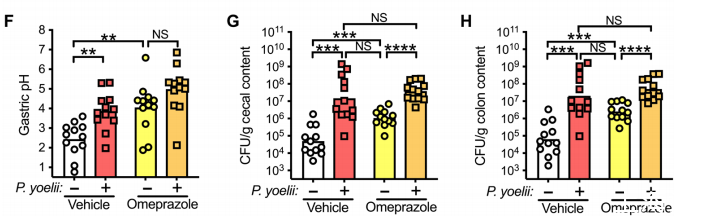 在補充實驗中,用質(zhì)子泵抑制劑奧美拉唑治療小鼠,以阻止胃酸分泌到胃腔,然后再進行鼠傷寒桿菌挑戰(zhàn)。對照組小鼠接受奧美拉唑治療后,胃pH值(圖3F)和鼠傷寒桿菌定植(圖3G和H)相對于接受藥物治療的小鼠都有所上升,這與之前觀察到的結果相同。然而,與給予載體的瘧原蟲感染小鼠相比,給予奧美拉唑并不會進一步增加鼠傷寒桿菌的定植(圖3G,H),也不會影響寄生蟲感染的嚴重程度(圖S6,C和D)。這表明,僅感染瘧原蟲對胃pH值的影響就足以最大限度地幫助接種細菌更好地在胃環(huán)境中生存。總之,這些數(shù)據(jù)表明,感染瘧原蟲的小鼠胃酸減少是導致其對傷寒桿菌感染易感性增加的原因,因為寄生蟲相關的低鹽血癥是促進胃內(nèi)接種細菌存活的必要條件,而胃酸減少反過來又會促進腸道定植。