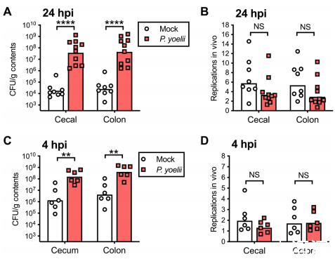 瘧原蟲沒有增強呼吸道生長缺陷,這讓我們產(chǎn)生了疑問:在共同感染的小鼠中,定植抗性的降低是否與鼠傷寒桿菌的快速生長有關?為了評估這個問題,我們給小鼠接種了攜帶乳糖抑制質(zhì)粒pAM34的鼠傷寒桿菌,該質(zhì)粒可用于短期評估細菌在低乳糖環(huán)境(如成年小鼠腸道)中的生長情況。挑戰(zhàn)24小時后,盡管共感染小鼠組的細菌定植量增加,但整個腸道的鼠傷寒沙門氏菌種群在瘧原蟲聯(lián)合感染和模型感染的小鼠中顯示出相同的復制率(圖2A,B)。耐人尋味的是,我們發(fā)現(xiàn)共感染小鼠在受到挑戰(zhàn)4小時后的傷寒桿菌定植率已經(jīng)更高,這也與體內(nèi)生長速度無關(圖2C,D)。鼠傷寒沙門氏菌感染量的這種快速差異并沒有伴隨著復制的增加,這表明細菌的快速生長并不是造成瘧原蟲感染小鼠定植增強的原因。