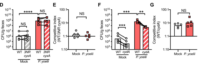 由于瘧原蟲感染期間招募的巨噬細胞通過硝酸鹽呼吸作用促進共生腸桿菌的生長,而且先前的工作表明,瘧原蟲感染也會招募巨噬細胞到盲腸粘膜,因此我們假設,同時發(fā)生的瘧疾可能會增加管腔內(nèi)硝酸鹽的供應量,從而促進傷寒桿菌的擴增。為了驗證這一觀點,我們用兩種菌株1:1的混合物感染小鼠,比較了鼠傷寒桿菌野生型與缺乏硝酸鹽還原酶活性的突變體(napA narG narZ cyxA突變體)的適應性。盡管共同感染組小鼠的腸道負擔總體上有所增加,但硝酸鹽呼吸的基因消減并沒有降低傷寒桿菌在瘧原蟲感染小鼠中的適應性(圖1D,E)。這一發(fā)現(xiàn)表明,在并發(fā)瘧疾期間,硝酸鹽的利用對于提高鼠傷寒桿菌的糞便恢復能力是不可或缺的。