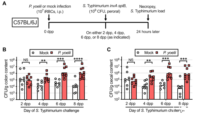 在實驗性瘧疾模型中,如約氏瘧原蟲(以下簡稱瘧原蟲),感染小鼠可改變腸道環(huán)境,降低對鼠傷寒沙門氏菌的定植抵抗力。然而,在感染后的較晚時間點,鼠傷寒沙門氏菌可以克服定植耐藥性,因為它的毒力因子,兩種III型分泌系統(tǒng)(T3SS-1和T3SS-2),引發(fā)腸道炎癥。為了從鼠傷寒沙門氏菌毒力因子對減弱定殖力的貢獻中分離出并發(fā)瘧疾的貢獻,在接種瘧原蟲后的不同時間點,小鼠組被感染野生型鼠傷寒沙門氏菌或缺乏T3SS-1(由于invA突變)和T3SS-2(由于SpiB突變)的invASpiB突變體(如圖1A所示)。當在瘧原蟲注射(DPP)后6天或更晚時,鼠傷寒沙門氏菌在感染瘧原蟲的小鼠的盲腸和結腸中定植的水平比對照小鼠高10到100倍(圖1B,1C,S1A)。這與鼠傷寒沙門氏菌的毒力無關,因為野生型和invA SpiB突變體都顯示出更強的定殖力(圖3)。6-dpp時間點與瘧原蟲在血液中擴展的高峰期相關(圖S2A)。此時,感染瘧原蟲的小鼠已持續(xù)出現(xiàn)嚴重貧血(圖S2B),體重大幅下降(圖S2C),而脾臟腫大在整個瘧原蟲感染過程中持續(xù)增加(圖S2D)。因此,6天后瘧原蟲接種被確定為最早的可靠時間點,以研究瘧疾相關定植抗性缺陷的根本原因,并被用作后續(xù)實驗的主要模型。