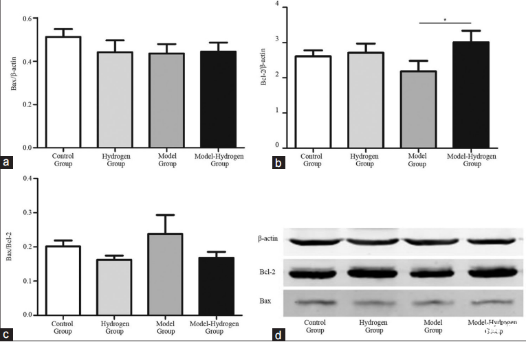 圖5、通過蛋白質印跡分析確定的Bax和Bcl-2表達。數據以均值±標準誤表示。(a)如圖d所示的Bax水平。(b)如圖d所示的Bcl-2水平。*P<0.05。(c)Bax/Bcl-2比值。(d)免疫印跡圖。Bcl-2:B細胞白血病/淋巴瘤2;Bax:BCL2相關X蛋白。