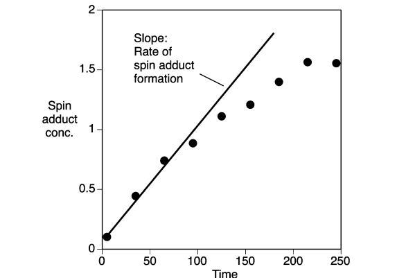 麥汁ESR強(qiáng)制老化測(cè)試:麥汁樣品(25.0毫升),含有5%(體積/體積)乙醇(96%純乙醇,丹麥蒸餾廠,奧爾堡,丹麥)和POBN[α-4-吡啶基-1-氧化物-N-叔丁基硝酮,Aldrich,St.Louis,MO],在密閉的藍(lán)蓋瓶(250毫升)中于室溫下攪拌10分鐘,以使反應(yīng)物溶解。瓶子內(nèi)有足夠的大氣空氣頂部空間。將瓶子轉(zhuǎn)移到預(yù)熱的水浴(T=55°C)(Heto Laboratory Equipment,Allerod,Denmark)中。在給定的時(shí)間間隔取出樣品(50μL)。使用Miniscope MS 200 X波段光譜儀(Magnettech,Berlin,Germany)記錄麥汁樣品的ESR光譜,使用50μL微量移液管作為樣品池(Brand GMBH,Wertheim,Germany)。使用的設(shè)置如下:微波功率,10 mW;掃描寬度,95.9 G;調(diào)制頻率,1000 mG;接收增益,900;掃描時(shí)間,60秒。所有光譜(單次掃描)均在室溫下記錄。光譜的振幅以中心雙峰的高度相對(duì)于TEMPO水溶液(2μM)ESR信號(hào)中心線的高度進(jìn)行測(cè)量和報(bào)告。TEMPO標(biāo)準(zhǔn)品在當(dāng)天第一個(gè)和最后一個(gè)樣品時(shí)進(jìn)行測(cè)量。所有樣品均進(jìn)行三次重復(fù)測(cè)量。麥汁樣品的氧化穩(wěn)定性通過(guò)自旋加合物形成的初始速率來(lái)量化,該速率由在強(qiáng)制老化期間自旋加合物濃度初始上升階段(在自旋加合物濃度開(kāi)始趨于平穩(wěn)之前)的線性回歸確定(圖3)。