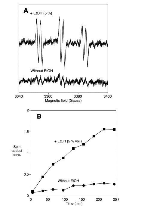 過(guò)氧化氫、過(guò)氧化氫酶和超氧化物歧化酶的影響:將過(guò)氧化氫(30%,Sigma-Aldrich,Steinheim,Germany)、過(guò)氧化氫酶(E.C.1.11.1.6,來(lái)自Scytalidium thermophilum的純酶,無(wú)葡萄糖氧化酶副活性,Novozymes A/S,Bagsvaerd,Denmark)或牛超氧化物歧化酶(E.C.1.15.1.1)(Sigma-Aldrich,Steinheim,Germany)在添加乙醇和POBN之前立即添加到冷藏的麥汁樣品中,并按上述方法進(jìn)行ESR強(qiáng)制老化實(shí)驗(yàn)。一個(gè)過(guò)氧化氫酶單位(CIU)對(duì)應(yīng)于在pH 7和30°C下每分鐘分解1μmol過(guò)氧化氫的酶量。CIU通過(guò)分光光度法測(cè)定,評(píng)估在30°C、50 mM磷酸鹽緩沖液(pH 7.0)中,過(guò)氧化氫酶在240 nm處去除H2O2的情況[ε=39.4 M?1cm?1],將在240 nm處吸光度從0.450(H2O2起始濃度為10.3 mM)降至0.400所需的時(shí)間(秒)轉(zhuǎn)換為每克酶產(chǎn)品的CIU。一個(gè)超氧化物歧化酶單位(SODU)將在偶聯(lián)系統(tǒng)(含黃嘌呤和黃嘌呤氧化酶)中,在pH 7.8、25°C、3.0 mL反應(yīng)體積下,使用引起550 nm處吸光度變化率為0.025每分鐘的黃嘌呤氧化酶濃度,抑制細(xì)胞色素c還原速率的50%。