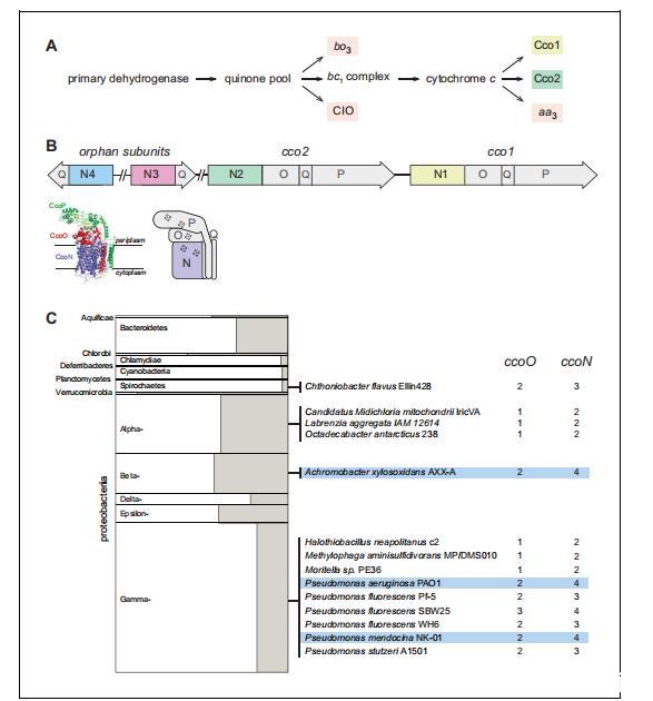 機會性病原體銅綠假單胞菌(Pseudomonas aeruginosa),一種能夠定植于植物和動物宿主的細菌(Rahme et al.,1995),具有分支的呼吸鏈,具有使用五種經典的末端氧化酶復合物將O2還原為水的潛力:兩種醌氧化酶(bo3(Cyo)和一種氰化物不敏感bd型氧化酶(CIO))和三種細胞色素c氧化酶(aa3(Cox)、cbb3-1(Cco1)和cbb3-2(Cco2))(圖1A)。幾篇關鍵出版物描述了銅綠假單胞菌的末端氧化酶補體,揭示了該生物特有的特征(Williams et al.,2007;Comolli and Donohue,2004;Alvarez-Ortega and Harwood,2007;Arai et al.,2014;Kawakami et al.,2010;Jo et al.,2014)。銅綠假單胞菌的不同尋常之處在于它編碼兩種屬于cbb3型家族的氧化酶。這些酶以其在低O2濃度下相對較高的催化活性以及僅限于細菌域(Brochier-Armanet et al.,2009;Pitcher and Watmough,2004)而著稱。(銅綠假單胞菌的cbb3型氧化酶通常被稱為cbb3-1和cbb3-2;然而,我們將使用‘Cco1’和‘Cco2’來表示這些酶,與其編碼基因的注釋一致。)大多數編碼cbb3型氧化酶的細菌基因組只包含一個此類復合物的操縱子,其在O2限制條件下特異性誘導(Cosseau and Batut,2004)。在銅綠假單胞菌中,cco2操縱子在低O2濃度生長期間被誘導,但cco1操縱子在高水平組成型表達(Comolli and Dono-hue,2004;Kawakami et al.,2010)。