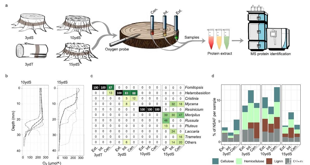 研究簡(jiǎn)介:森林作為地球生態(tài)系統(tǒng)的重要組成部分,其微生物群落對(duì)碳循環(huán)起著關(guān)鍵作用。真菌作為主要的木質(zhì)素纖維素分解者,對(duì)森林生態(tài)系統(tǒng)中的碳儲(chǔ)存和循環(huán)至關(guān)重要。以往的研究主要集中在有氧條件下的木材降解機(jī)制,而對(duì)于缺氧環(huán)境下的木材降解了解甚少。本研究旨在填補(bǔ)這一知識(shí)空白,探索真菌在缺氧條件下的木材降解能力。研究團(tuán)隊(duì)從丹麥的斯滕肖爾特森林中采集了不同腐爛階段的云杉木材樣本,并使用針式氧氣傳感器測(cè)量了木材內(nèi)部的氧氣濃度。通過蛋白質(zhì)組學(xué)分析,研究團(tuán)隊(duì)鑒定了參與木材降解的真菌及其分泌的酶類。此外研究團(tuán)隊(duì)在實(shí)驗(yàn)室中模擬了自然環(huán)境中的氧氣梯度,通過固態(tài)培養(yǎng)技術(shù)觀察松生擬層孔菌在有氧和無氧條件下的生長(zhǎng)和木材降解能力,并利用13C固體核磁共振技術(shù)分析了木材細(xì)胞壁成分的變化。本研究深入探討了褐腐真菌松生擬層孔菌(Fomitopsis pinicola)在缺氧條件下對(duì)木材的降解機(jī)制。研究人員通過在自然環(huán)境中對(duì)木材樣本進(jìn)行實(shí)地采樣,并結(jié)合實(shí)驗(yàn)室的體外實(shí)驗(yàn),揭示了松生擬層孔菌在完全缺氧環(huán)境下依然能夠生長(zhǎng)并分解木材的現(xiàn)象,這一發(fā)現(xiàn)挑戰(zhàn)了傳統(tǒng)認(rèn)知,即這類真菌僅在有氧條件下才能有效降解木材。本研究不僅增進(jìn)了我們對(duì)自然環(huán)境中木質(zhì)素纖維素降解機(jī)制的理解,還為開發(fā)基于生物的厭氧過程提供了新的思路。這些發(fā)現(xiàn)對(duì)于理解森林生態(tài)系統(tǒng)中碳循環(huán)的復(fù)雜性具有重要意義,并可能為開發(fā)新的生物技術(shù)應(yīng)用,如生物燃料生產(chǎn)和生物降解材料的開發(fā)。