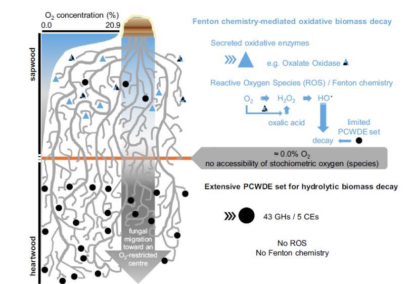 圖5、圖解模型說明了在缺氧條件下,平孔擬南芥在木材中的滲透。展示了褐腐真菌如何在缺氧條件下穿透木材。研究數(shù)據(jù)表明,從有氧條件下的芬頓化學(xué)介導(dǎo)的木材降解轉(zhuǎn)變?yōu)槿毖鯒l件下的PCWDE(植物細(xì)胞壁降解酶)驅(qū)動(dòng)的水解分解。與褐腐真菌的分階段降解機(jī)制一致。