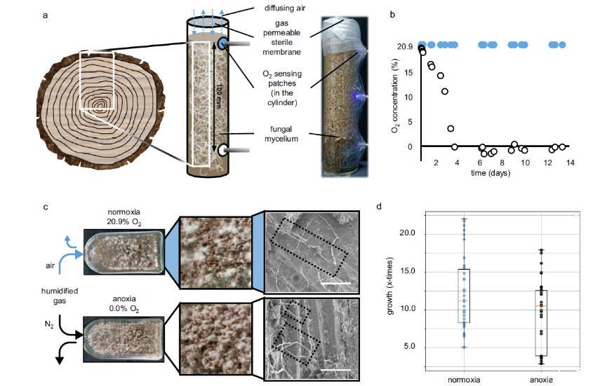 圖2、對(duì)不同木材深度處的真菌及其酶的代謝組學(xué)鑒定。a)模擬真菌在從樹干表面到內(nèi)部(從有氧到缺氧)的整個(gè)徑向梯度的固態(tài)培養(yǎng)設(shè)置,允許非侵入式測(cè)量頂部(藍(lán)色貼片)和底部(白色貼片)的O?濃度。b)在頂部(藍(lán)色)和柱底(白色)測(cè)量的O?濃度,分別代表空氣-木材界面和柱底的O?濃度。c)在有氧和缺氧條件下,松木上的Fomitopsis pinicola的固態(tài)培養(yǎng)。