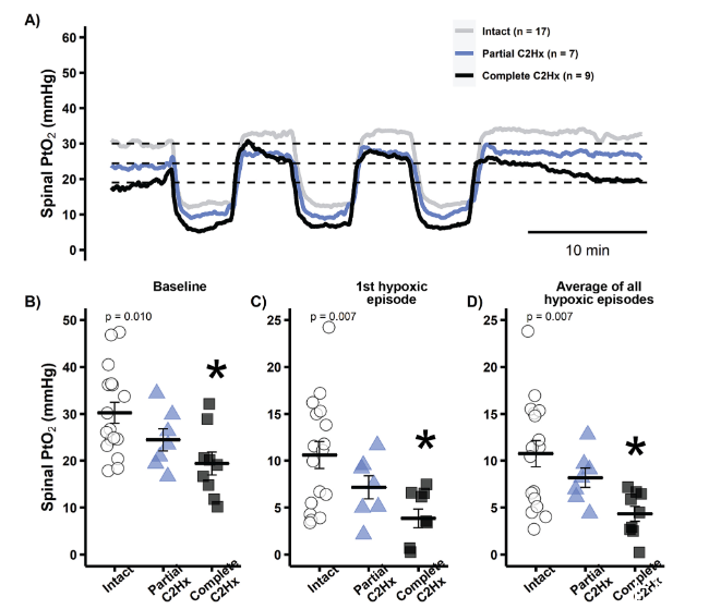 圖2、脊柱C2半切(C2Hx)后兩周,基線和中度急性間歇性缺氧(AIH)發作期間膈運動核附近的脊髓組織氧壓(PtO)受損。A)mAIH期間所有完整,部分C2Hx和完整C2Hx大鼠的脊髓PtO平均痕跡。B-D)脊柱PtOat基線,分別在第一次缺氧發作期間和三個缺氧發作的平均值。單因素方差分析在面板上產生p值。