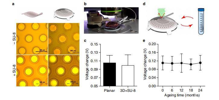 為了驗(yàn)證POLYRETINA的長期功能,我們測試了半球形的機(jī)械影響。為此,我們在圓球形的PDMS支架上粘接了PDMS光伏界面。粘合過程會(huì)在PDMS光伏界面上產(chǎn)生拉伸應(yīng)力,導(dǎo)致聚合物和鈦陰極出現(xiàn)裂縫(圖8a,上排)。為避免鈦陰極出現(xiàn)裂縫,在接口基底的每個(gè)陰極下方都集成了SU-8剛性平臺(tái)。有了這一預(yù)防措施,SU-8硬質(zhì)平臺(tái)上方的像素就不會(huì)出現(xiàn)裂縫(圖8a,底排);圖像與圖1c中的綠色區(qū)域相對應(yīng)。在SU-8硬質(zhì)平臺(tái)之間的混合薄膜內(nèi)仍會(huì)出現(xiàn)裂縫,但這并不那么重要,因?yàn)樵搮^(qū)域已被PDMS封裝,以防止分層,而且在陰極定義區(qū)域外光產(chǎn)生的載流子不會(huì)對電極/電解質(zhì)界面產(chǎn)生的光電勢/電流產(chǎn)生重大影響。然后,我們使用KPFM測量表面電位的變化(圖8b)。由于假體呈半球形,原子力顯微鏡針尖只能觸及假體頂部的電極(直徑80微米,開口67微米)。與平面PDMS表面相比,照明引起的表面電位變化沒有統(tǒng)計(jì)學(xué)差異(圖8c)。