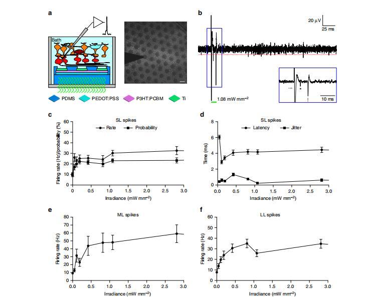 接下來,我們測試了PDMS光伏界面在刺激RGC(視網(wǎng)膜神經(jīng)節(jié)細(xì)胞)方面的體內(nèi)外功效。為此,我們使用了視網(wǎng)膜變性小鼠模型,該模型被公認(rèn)為是視網(wǎng)膜色素變性的絕佳模型。為了盡可能避免存活光感受器的自然反應(yīng),我們從老齡小鼠的視網(wǎng)膜上采集了假體誘發(fā)的RGCs尖峰活動(dòng)的胞外記錄。視網(wǎng)膜被分層覆蓋在PDMS-光伏界面中央5毫米的區(qū)域上,模擬視網(wǎng)膜外結(jié)構(gòu)(圖6a)。根據(jù)PC密度測定結(jié)果,我們只測試了10ms脈沖(PC響應(yīng)峰值),輻照度范圍很廣(從47.35到29.07μW mm-2)。光脈沖在記錄的RGC中誘發(fā)了假體誘發(fā)的尖峰活動(dòng)(圖6b)。尖峰用閾值算法檢測(圖6b),轉(zhuǎn)換成光柵圖,并顯示為刺激周時(shí)間直方圖。正如之前所報(bào)道的,我們觀察到了三種類型的反應(yīng),分別為短潛伏期、中潛伏期和長潛伏期(SL、ML和LL)。SL尖峰的出現(xiàn)(在光開始后10ms內(nèi)誘發(fā),1個(gè)分區(qū))表明RGC受到了直接的電刺激;而ML和LL尖峰的出現(xiàn)則表明網(wǎng)絡(luò)介導(dǎo)的激活。我們發(fā)現(xiàn),從測試的第一個(gè)輻照度(47.35μW mm-2)開始就能誘發(fā)SL尖峰,然后發(fā)射率緩慢上升,并在1.08mW mm-2以上保持穩(wěn)定,直到測試的最高輻照度(圖6c)。然而,第一個(gè)輻照度下的平均潛伏期(圖6d)相對較長(6.05±0.23ms);隨著輻照度的增加,潛伏期逐漸縮短,當(dāng)輻照度高于1.08mW mm-2時(shí),潛伏期穩(wěn)定在4.12±0.07ms(圖6d)。在此范圍內(nèi)(高于1.08),輻照度的平均抖動(dòng)為0.39±0.05ms。這表明,在輻照度高于1.08mW mm-2時(shí),SL響應(yīng)達(dá)到飽和,這與PC密度的測量結(jié)果相符。當(dāng)輻照度低于1.08mW/mm2時(shí),平均延遲時(shí)間似乎更短,但抖動(dòng)變化更大,表明響應(yīng)更不穩(wěn)定(圖6d)。ML(圖6e)和LL(圖6f)尖峰的發(fā)射率逐漸增加,但在1.08mW mm-2之后也變得穩(wěn)定。作為對照,當(dāng)視網(wǎng)膜分層在裸露的PDMS基底面上時(shí),在所有測試的輻照度下均未檢測到光誘發(fā)反應(yīng)。正如其他人已經(jīng)證明的那樣,我們還在第二個(gè)細(xì)胞亞群中驗(yàn)證了使用突觸阻斷劑可以取消ML和LL尖峰的人工激活。這證實(shí)了ML和LL是由內(nèi)部視網(wǎng)膜回路激活誘發(fā)的假設(shè)。