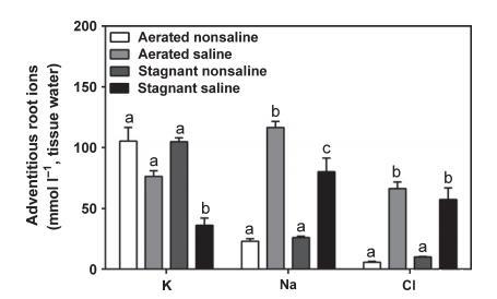 ?K濃度:通氣非鹽、通氣含鹽和停滯非鹽處理相似(76-105 mmol L?1組織水);停滯含鹽處理降至對照的34%(P<0.05)(圖5)。