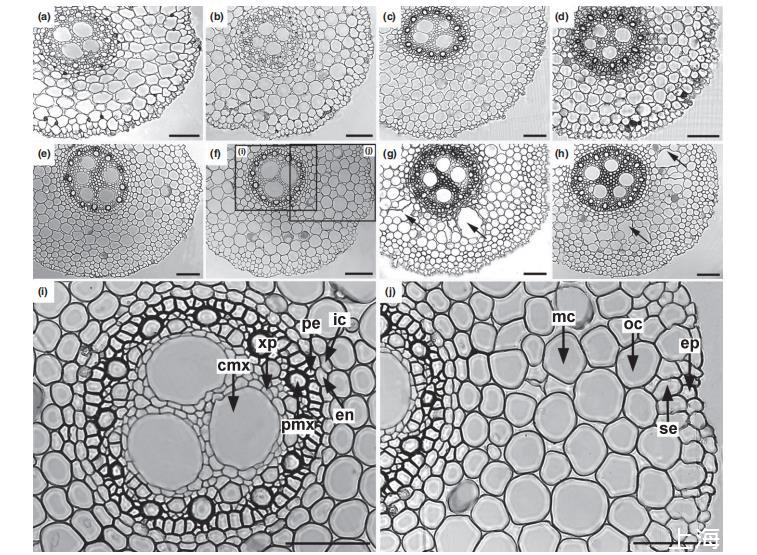 木質部鉀濃度及關于木質部成熟度的說明在所有處理中,距離根尖10 mm處的外周和中心后生木質部導管中的鉀濃度都相對較高,表明這些導管可能尚未成熟,含有細胞內容物而不是木質部汁液(圖4a)。這與Huang&Van Steveninck(1988)的研究一致,他們報道了在通氣營養液中生長的年輕大麥幼苗種子根距離根尖10 mm處,木質部導管中鉀濃度很高。在他們的研究中,距根尖50 mm處外周后生木質部的K濃度下降,但在距離根尖達150 mm處中心后生木質部的K濃度仍保持較高水平。對于本研究中的根,我們不確定距離根尖50 mm處的木質部導管是否成熟。在14-17天水培生長的大麥幼苗不定根(最大長度75 mm)中,軸向水力阻力從根尖開始隨距離增加而降低,直到距根尖約60 mm處,表明直到這個位置并非所有木質部導管都已成熟(Knipfer&Fricke,2011)。在本研究中,在距離根尖50 mm處,外周后生木質部的鉀濃度在通氣溶液中生長的根中往往高于在停滯溶液中生長的根(圖4b)。對于停滯處理中生長較慢的根,在距離根尖相同距離處的組織會比通氣處理中生長較快的根更老。因此,在停滯處理中,生長較慢的根,其木質部導管可能在更靠近根尖處成熟。