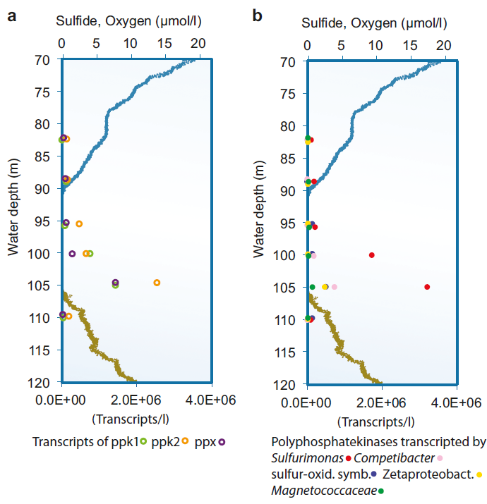 圖4、與聚磷酸鹽相關的基因轉錄。a)已知聚磷酸鹽激酶(Ppk1、Ppk2)和外切磷酸酶(Ppx)基因轉錄本在每升水中的數量。所有三種酶的基因在磷酸鹽釋放區表達量最高。b)不同細菌群落轉錄聚磷酸鹽激酶的情況,顯示五個最重要的群落:硫單胞菌屬(紅色)、競爭菌屬(粉色)、硫氧化共生菌(藍色)、ζ變形菌綱(黃色)和磁球菌科(綠色)。內的黃色聚磷酸鹽(polyP)內含物。