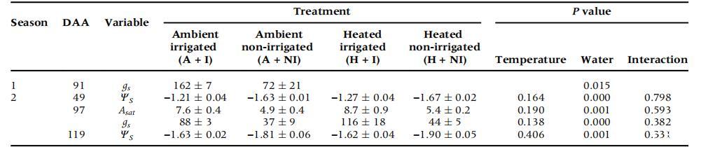 在第二季,中午的莖干水勢(ψs)反映了對NI葡萄藤的水分脅迫。升溫葡萄藤沒有表現出水分脅迫,在氣體交換性狀或ψs方面與灌溉沒有相互作用(表1)。在第二季中,有兩次觀察到NI藤蔓的gs受到類似的抑制,與A+I藤蔓相比,光飽和時的二氧化碳凈同化(Asat)顯著降低(表1)。