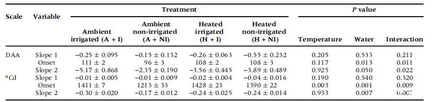 將第2季的CD與花期開始的熱時間作圖(圖3e),結果表明,與A+I葡萄藤相比,A+NI葡萄藤的活體組織開始快速衰退的時間更早,快速階段(斜率2)也更小(表2)。升溫增加了CD快速階段開始的熱時間,并且與灌溉有顯著的交互作用(表2)。缺水減緩了未升溫葡萄植株活體組織的快速衰退(斜率2),且與溫度有顯著的交互作用(表2)。在快速階段開始之前,處理或交互作用對CD緩慢階段的斜率沒有影響(表2)。