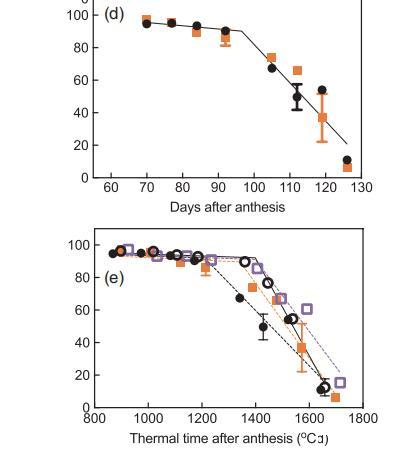 圖3、第1季(a)和第2季(b-d)從花期開始的一段時間內漿果活體組織的比例,以及從花期開始的熱量時間內(e)比較以下處理:常溫灌溉(A+I)(白圈)、常溫非灌溉(A+NI)(黑圈)、升溫灌溉(H+I)(白方塊)、升溫非灌溉(H+NI)(橙方塊)。為清楚起見,(c)中重復了A+I,以便與H+I進行比較;(d)中重復了A+NI,以便與H+NI進行比較。