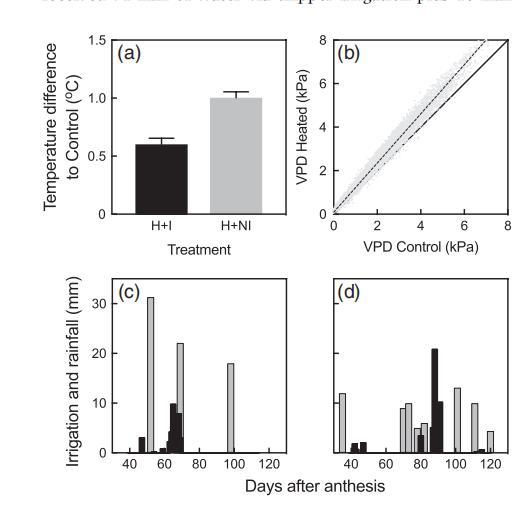 在第2季的40至125 DAA期間,常溫灌溉處理的日最高環境溫度為21.2至44.5攝氏度,而日最低溫度為6.3至22.8攝氏度。同期,升溫灌溉的日最高氣溫平均升高0.6攝氏度,升溫非灌溉的日最高氣溫平均升高1.0攝氏度(圖1a),但對最低氣溫沒有影響。灌溉型葡萄樹較大的樹冠削弱了被動升溫的效果。VPD的升高與最高溫度的升高成正比(圖1b)。