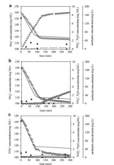 通過批式測試2研究的pH對作為硝酸鹽還原中間產物的N2O積累的影響顯示于圖4。由于初始COD與NO??-N比為1.5:1,甲醇量不足以完全去除硝酸鹽。因此,在所有實驗中觀察到兩個不同的還原階段:存在甲醇作為外源碳源時的反硝化(0至約100分鐘),其中硝酸鹽以較高速率還原;和無外源碳源時的反硝化(內源反硝化)(100–300分鐘),其中硝酸鹽以低得多速率還原。