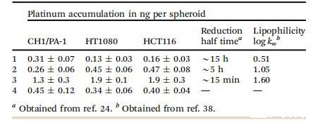 在缺氧球體(3D)模型(直徑為>400μm的球體,HIF1a和PI染色陽性)中,細胞毒性的程度因化合物而異。在CH1/PA-1球形模型中,化合物1-4的活性轉移到更低的IC50值,而沙鉑和奧沙利鉑則受到負面影響。這些結果突顯了細胞系CH1/PA-1的敏感性,因為在敏感性較低的細胞系HT1080和HCT116中,大多數IC50值都會升高,只有HT1080細胞中的1例外。在比較三維CH1/PA-1模型中獲得的結果和還原速度時,可以明顯看出,還原速度較慢的物質1(系數6.8)的細胞毒性效力最大,而還原速度較快的物質2和3(系數分別為1.6和1.7)在缺氧條件下只顯示出輕微的激活作用。雖然在敏感性較低的細胞系HT1080和HCT116中,所有細胞毒性效力都受到了負面影響,但各因子的下降順序相似:1(因子1.3和0.6)>2(因子0.7和0.3)>3(因子0.4和0.1)。