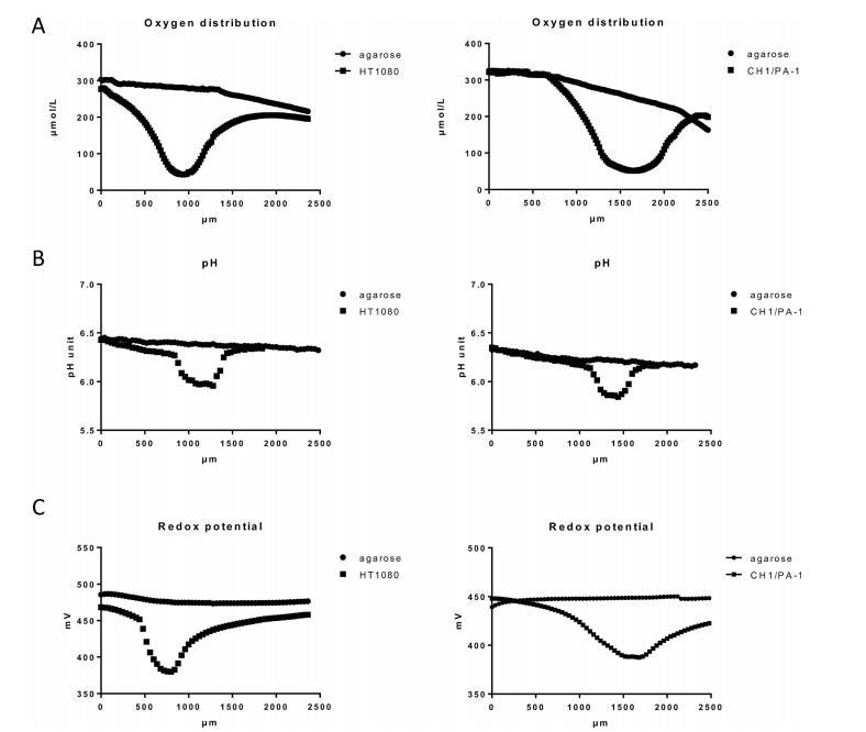 圖2、通過瓊脂糖包埋的HT1080和CH1/PA-1多細胞球體(直徑>400μm)與遠離球體的瓊脂糖培養基的物理化學梯度比較,由微電極測量并以代表性樣本為例。(A)氧分布(以20μm為間隔測量),(B)pH值(以40μm為間隔測量),(C)氧化還原電位(以40μm為間隔測量)。剖面深度是相對于瓊脂糖表面而言的,因此球體相對于瓊脂糖表面的位置各不相同。