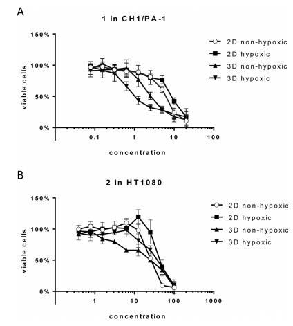 圖3、化合物1和2在缺氧與非缺氧球形細胞和缺氧與非缺氧單層細胞中的細胞毒性。(A)1在CH1/PA-1細胞中的濃度效應曲線。(B)2在HT1080細胞中的濃度效應曲線。