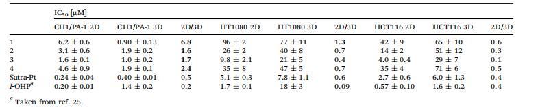 表1、復合物1-4、沙鉑和奧沙利鉑(l-OHP)在缺氧球狀(三維)模型和非缺氧單層(二維)模型中的細胞毒性,通過阿拉瑪藍檢測法測定(暴露時間96小時)。