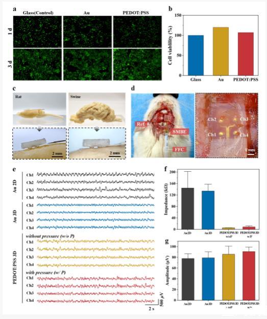 與現(xiàn)有的其他柔性3D電極相比,SMBE的優(yōu)勢一目了然。首先是高度上的優(yōu)勢,330微米的高度,讓它能更好地跨越電極與組織之間的距離,有效避免氣泡捕獲和蛋白質(zhì)積聚等問題。其柔軟性更是一大亮點,就像一層溫柔的“保護膜”,能極大地減少對目標(biāo)組織的機械損傷。而且它的擴展性很強,易于定制的3D軟凸起結(jié)構(gòu)和通用組裝方法,讓其應(yīng)用范圍不再局限于大腦皮層,脊髓、周圍神經(jīng)、類器官等都可能成為它的“用武之地”。另外,電極與組織的微壓縮界面,就像一個信號“增強器”,能提高記錄的信噪比,還能控制刺激閾值。