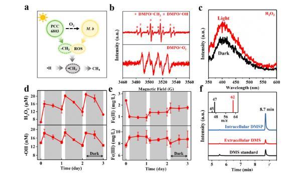圖4、PCC6803-M.b-Fe-EDTA的非生物甲烷生成。a)使用PCC6803-M.b-Fe-EDTA的非生物甲烷生成示意圖。b)?CH3、?OH和?O2-的EPR譜圖。c)使用o-tolidine作為過氧化物指示劑的H2O2的UV/Vis吸收譜圖。d-e)H2O2和?OH(d),以及Fe(II)和Fe(III)(e)濃度的典型時間變化。灰色區域表示黑暗期。f)表征DMS和DMSP作為甲基供體(插圖顯示了DMS的質譜圖)。