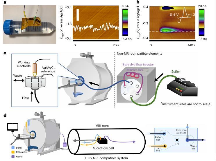 該方案的硬件核心在于一套定制化的磁共振兼容電化學(xué)檢測系統(tǒng)。研究團隊采用聚酰亞胺包覆的熔融石英毛細管封裝T-650碳纖維制備工作電極,以銀/氯化銀(Ag/AgCl)作為參考電極,搭配磁共振兼容的三軸電纜與定制頭端放大器。碳纖維材料不僅具備優(yōu)異的導(dǎo)電性與生物相容性,其低磁敏感性可最大限度減少MRI圖像偽影;聚酰亞胺涂層則進一步降低了電極與磁場的相互作用,確保在高磁場環(huán)境下的信號穩(wěn)定性。