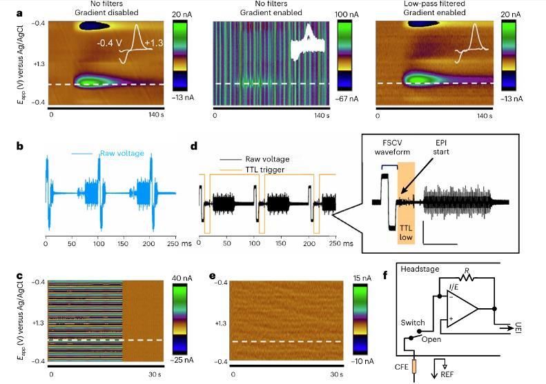為實現(xiàn)FSCV與fMRI的無干擾同步,研究團隊開發(fā)了基于TTL(晶體管-晶體管邏輯)觸發(fā)的時序交錯采集系統(tǒng)。該系統(tǒng)通過定制同步盒連接MRI主控單元與FSCV數(shù)據(jù)采集設(shè)備,使兩種模態(tài)的采樣時序嚴格對齊。具體而言,梯度回波-平面成像(GE-EPI)序列的每個掃描周期(約2s)內(nèi),F(xiàn)SCV采集被分配在梯度脈沖間隙的100ms窗口內(nèi)進行,通過低通貝塞爾濾波(截止頻率1kHz)進一步抑制電磁干擾(圖4)。