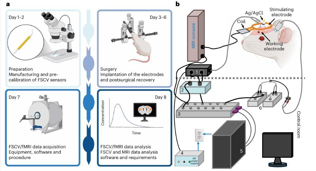 北卡羅來納大學(xué)教堂山分校的Tatiana A.Shnitko、Yen-Yu Ian Shih團隊在《Nature Protocols》發(fā)表的創(chuàng)新性研究,提出了一套將快速掃描循環(huán)伏安法(FSCV)與fMRI深度融合的實驗協(xié)議,首次實現(xiàn)了活體動物腦內(nèi)神經(jīng)化學(xué)動力學(xué)與全腦血氧水平依賴(BOLD)信號的同步采集,為破解多模態(tài)整合難題提供了革命性解決方案。該方案通過磁共振兼容硬件設(shè)計、精準時序控制與多階段驗證體系,有效克服了偽影干擾、硬件沖突等技術(shù)瓶頸,為探索神經(jīng)血管耦合機制及相關(guān)疾病病理生理過程開辟了新路徑。