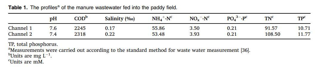 樣本取自中國(guó)南方浙江省嘉興市一個(gè)典型水稻種植區(qū)的稻田。在一個(gè)水稻-小麥輪作系統(tǒng)中,糞肥施用(生長(zhǎng)季節(jié)的4月至每月兩次)已持續(xù)20多年。糞肥主要由牲畜廢物(包括尿液、糞便和沖洗水)構(gòu)成,這些廢物主要在鄰近農(nóng)場(chǎng)發(fā)酵,并通過(guò)兩個(gè)渠道輸入稻田。糞肥含有高銨態(tài)氮(NH4+-N)和化學(xué)需氧量(COD;表1)。其中,銨占全氮(TN)含量的49-60%。選擇一個(gè)相鄰未受糞肥影響且未種植水稻的地塊作為對(duì)照。土壤樣本于2009年11月收獲后(無(wú)水淹條件下)從0-100厘米深度采集。從每個(gè)地塊取三個(gè)土壤巖心(直徑約5厘米),將同一深度(每10厘米間隔)的樣本混合形成一個(gè)復(fù)合樣本。樣本在運(yùn)輸?shù)綄?shí)驗(yàn)室時(shí)密封在無(wú)菌塑料袋中并置于冰上。一部分在4°C儲(chǔ)存用于培養(yǎng)實(shí)驗(yàn),另一部分通過(guò)2.0毫米篩用于土壤特性分析。其余部分在-80°C儲(chǔ)存用于DNA提取和下游分析。