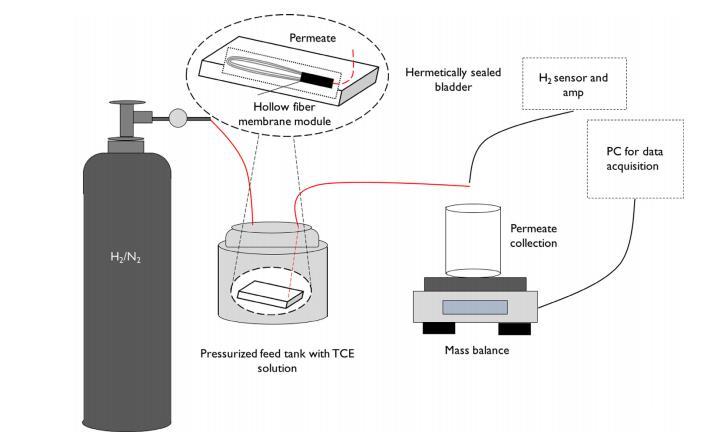 脫氯實驗在流穿模式下進行,使用死端中空纖維組件,在加壓密封氣囊(High Sierra)中零頂空放置于不銹鋼壓力容器中(圖1)。使用微電極和信號放大器(Unisense)監測H2濃度。在6小時泄漏測試中無H2損失。在測量膜反應性前,通過在無反應條件下過濾9.25 mg/L的TCE溶液耗盡吸附容量。耗盡實驗后,使用9.9 mg/L TCE溶液飽和H2(0.8 mM)測定反應性。對于以硫化物作為毒物的實驗,使用氧化處理后的0.7μM或2μM殘留硫化物溶液。中空纖維膜的催化活性按照先前描述的平板膜程序測定。對照測試使用相同進料溶液和相同過濾條件進行,但使用無催化劑的PSf和無催化劑的xGnP/PSf中空纖維膜。