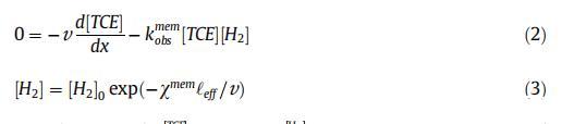 其中v(m/s)是空塔速度,kobs mem?eff((m/s)(MH2)-1)是膜中TCE的反應通量,χmem是H2分解的一級反應常數,χmem?eff(m/s)是膜中H2的反應通量。