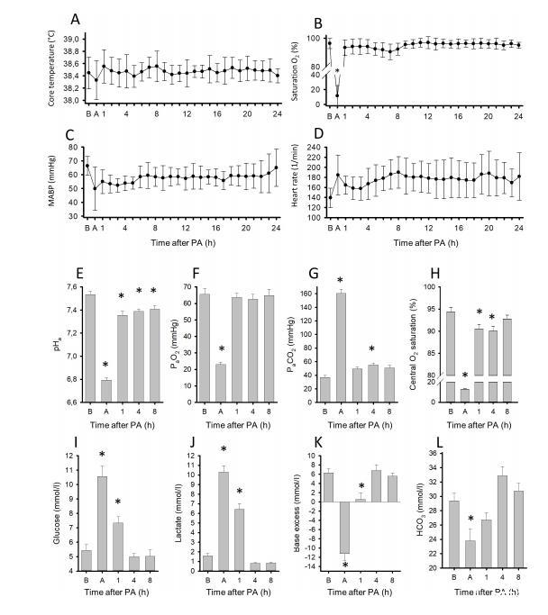 pHbrain的改變不僅在急性PA期間發(fā)揮重要作用,在復(fù)蘇/再氧合后也具有重要病理生理學(xué)意義。先前的研究報(bào)道仔豬在從PA恢復(fù)后pHbrain保持穩(wěn)定,但未對(duì)恢復(fù)4小時(shí)后的情況進(jìn)行隨訪。相反,我們當(dāng)前的研究將窒息后觀察期延長(zhǎng)至24小時(shí)。我們發(fā)現(xiàn)在該仔豬PA/HIE模型中,PA后24小時(shí)期間未出現(xiàn)pHbrain的重大繼發(fā)性改變。