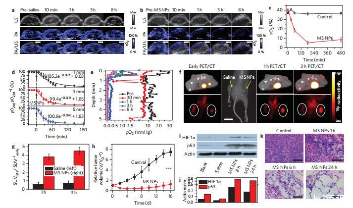 然后,在雙側(cè)4T1異種移植腫瘤小鼠身上評(píng)估了MS NPs作為體內(nèi)DOA用于腫瘤饑餓療法的潛在資格,在右側(cè)腫瘤內(nèi)注射MS NPs,在左側(cè)腫瘤內(nèi)注射生理鹽水作為對(duì)照。通過多波長(zhǎng)光聲(PA)和B型超聲(US)圖像的聯(lián)合注冊(cè),實(shí)時(shí)定量監(jiān)測(cè)瘤內(nèi)血氧飽和度(sO2)的變化,即血紅蛋白結(jié)合氧的水平。對(duì)照組的sO2值幾乎保持不變,約為37%,與注射前持平(圖5a,c),這證實(shí)了4T1實(shí)體瘤在此期間的輕微缺氧性質(zhì),以及生理鹽水本身對(duì)瘤內(nèi)sO2的影響微乎其微。值得注意的是,從注射MS NPs十分鐘后開始,sO2就急劇下降,這種下降趨勢(shì)一直持續(xù)到三小時(shí),瘤內(nèi)血氧幾乎被完全清除(圖5b、c),這表明HbO2被有效脫氧。同時(shí),金標(biāo)準(zhǔn)氧微電極顯示,腫瘤組織中溶解的游離氧也同樣被徹底清除(圖5d、e)。瘤內(nèi)溶解氧原始微輪廓的明顯波動(dòng)表明,實(shí)體瘤中的氧分布是不均勻的,而在注射MSNP后,這種不均勻性被大幅消除,達(dá)到了持久的零氧張力。從理論上講,細(xì)胞生長(zhǎng)的有利微環(huán)境主要依賴于血紅蛋白結(jié)合氧和組織內(nèi)溶解氧之間的平衡,因此腫瘤內(nèi)這兩種氧的完全耗竭將不可避免地導(dǎo)致嚴(yán)重缺氧以及隨后的細(xì)胞壞死和凋亡。