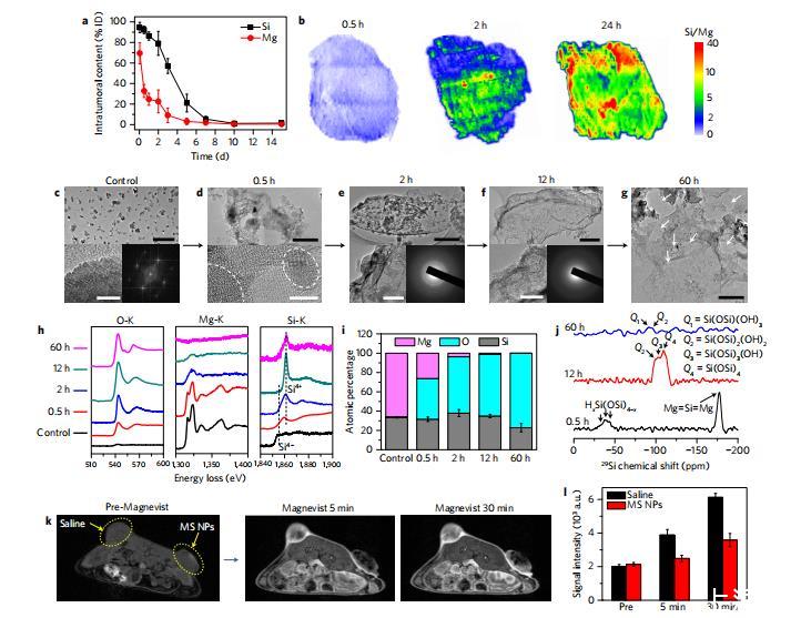 從更微觀的角度來看,時(shí)間序列TEM圖像和電子能損耗譜(EELS)顯示,瘤內(nèi)Mg2Si晶體納米顆粒逐步轉(zhuǎn)變?yōu)闊o定形微片。這種轉(zhuǎn)變伴隨著顯著的氧捕獲和鎂消除,更明顯的是,硅的價(jià)態(tài)從-4急劇逆轉(zhuǎn)為+4(圖6c-i)。根據(jù)29Si固態(tài)魔角旋轉(zhuǎn)核磁共振(MASNMR)結(jié)果(圖6j),發(fā)現(xiàn)最初的脫氧產(chǎn)物是不飽和HxSi(OSi)4-x物種,即包裹結(jié)晶MSNP的無定形物質(zhì)(圖6d)。正如定義明確的Q2和Q3物種所示,這些中間產(chǎn)物被進(jìn)一步氧化并凝結(jié)成富含硅醇基團(tuán)的SiO2微片。這一發(fā)現(xiàn)顯然證實(shí)了組織內(nèi)SiO2微片形成的溫和、逐步脫水-縮合機(jī)制,從而使這些動(dòng)態(tài)生成的聚集體成為有效的腫瘤毛細(xì)血管阻斷劑,阻止紅細(xì)胞的循環(huán)。