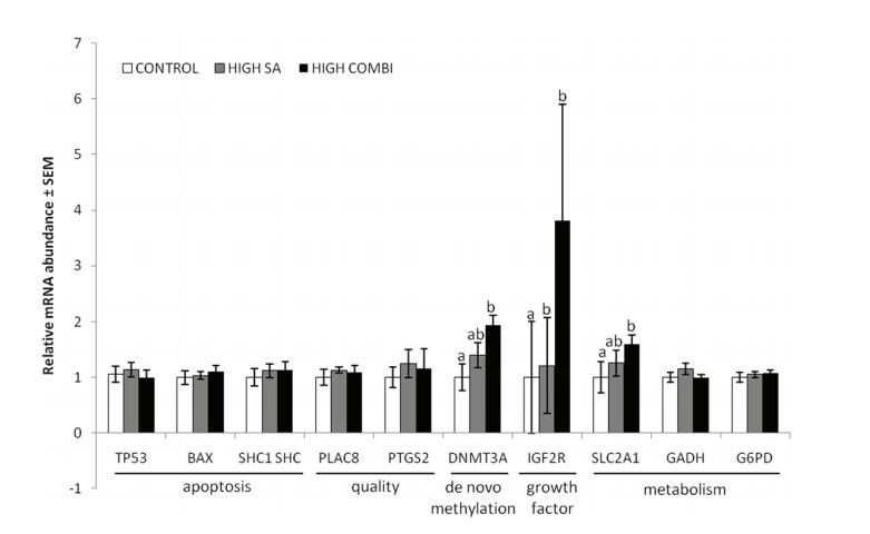 我們接下來(lái)研究了囊胚中與凋亡、發(fā)育、質(zhì)量和代謝相關(guān)的關(guān)鍵基因表達(dá)。出乎意料的是,許多這些基因的表達(dá)模式在由HIGH SA成熟卵母細(xì)胞產(chǎn)生的胚胎與對(duì)照組之間無(wú)差異。然而,這些數(shù)據(jù)表明DNA甲基化和葡萄糖轉(zhuǎn)運(yùn)的調(diào)控存在差異;與對(duì)照組相比,來(lái)自HIGH COMBI條件下成熟卵母細(xì)胞的囊胚中DNMT3A和SLC2A1均上調(diào)。與對(duì)照組相比,在HIGH SA或HIGH COMBI條件下成熟的任一組中,IGF2R基因表達(dá)均上調(diào)。