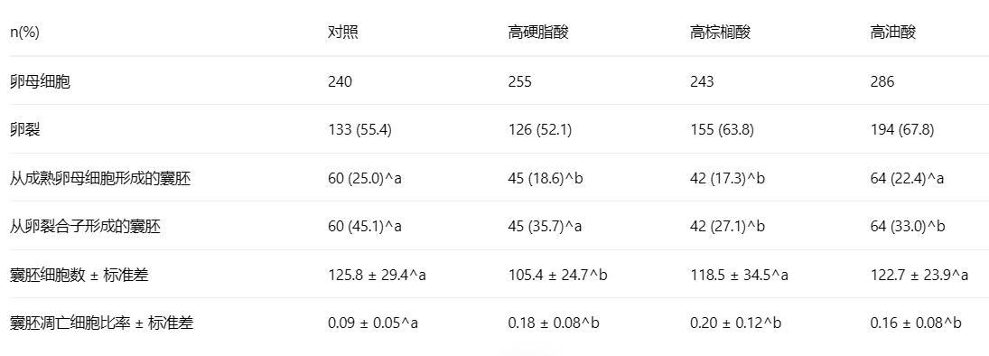 在成熟培養(yǎng)基中補(bǔ)充不同NEFA組合對(duì)卵裂率無(wú)顯著影響,但基于比值比,在升高硬脂酸(HIGH SA)或補(bǔ)充升高硬脂酸(SA)、棕櫚酸(PA)和油酸(OA)濃度組合(HIGH COMBI)的培養(yǎng)基中成熟卵母細(xì)胞導(dǎo)致受精后第7天達(dá)到囊胚階段的卵母細(xì)胞數(shù)量顯著減少。HIGH COMBI處理還減少了形成囊胚的卵裂合子數(shù)量,與對(duì)照組相比。與對(duì)照組相比,HIGH SA組中卵裂合子成為囊胚的傾向較低。HIGH SA和HIGH COMBI暴露during maturation對(duì)發(fā)育能力的影響數(shù)據(jù)見(jiàn)表1。