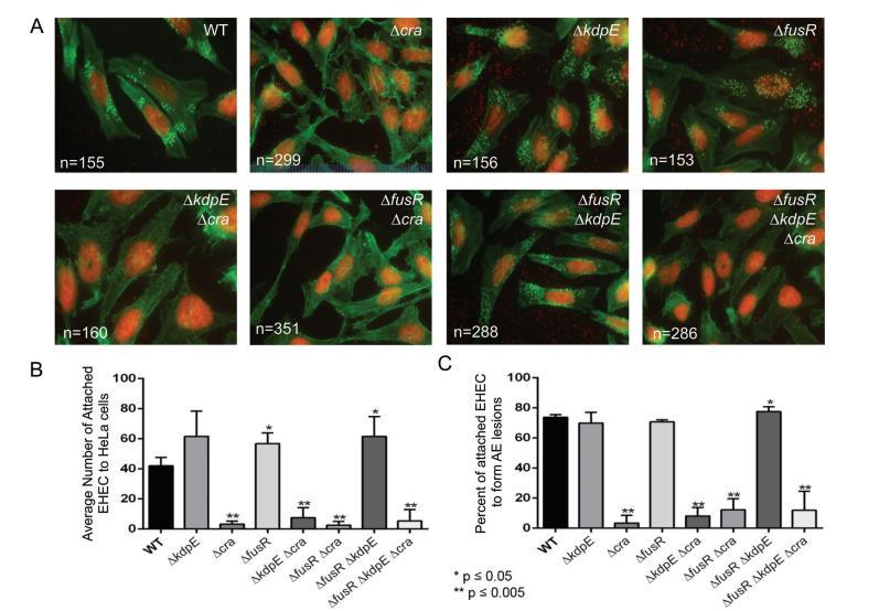 由于Cra、KdpE和FusR影響LEE基因表達(這是AE病變形成所必需的),我們接下來評估了這些轉錄因子在AE病變形成調控中的作用。為了形成AE病變,EHEC使用專門效應器緊密附著哺乳動物細胞并重組肌動蛋白以包裹細菌,形成pedestal樣結構。為了assay刪除cra、kdpE或fusR(單獨或組合)是否影響EHEC AE病變形成,感染HeLa細胞并評估形成的AE病變數量和每個病變附著的細菌數量。與WT細菌(41.99±5.46)相比,ΔfusR(56.74±7.11)和ΔfusRΔkdpE(61.52±13.07)菌株顯著更多細菌附著HeLa細胞,分別有73.68%、70.67%和77.44%的附著細菌能夠形成AE病變(圖1A至C)。任何刪除cra的菌株附著HeLa細胞或與AE病變相關的細菌數量顯著減少。雖然ΔkdpE菌株有更多附著細菌(61.56±16.74),69.86%形成pedestals,與WT相比,這些數據不顯著。總體而言,這些數據表明Cra是EHEC中AE病變形成的強激活劑;然而,單獨刪除fusR或與kdpE組合顯示這些調節器在EHEC附著HeLa細胞前抑制或改變AE病變形成的動力學。