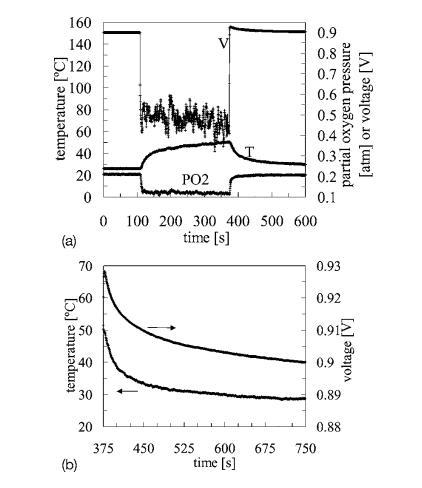 在IV極化期間,自呼吸燃料電池陰極表面上方的溫度、PO2和PH2O的微傳感器測量反映了這些量隨電流密度增加而發(fā)生的顯著變化。觀察到PO2線性下降和PH2O線性增加,這與通量平衡一致。在最大功率點附近RH出現(xiàn)最大值,這與PH2O線性增加和溫度隨電流密度增加呈指數(shù)增長相一致。